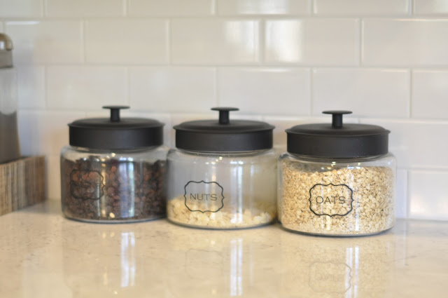 Shelli from House of Smiths was sweet enough to send me the vinyl decals for our glass jars. I got my jars at Pier One, but I've also seen them at Hobby Lobby. I like them because they have rubber inside the lid to keep them air tight.